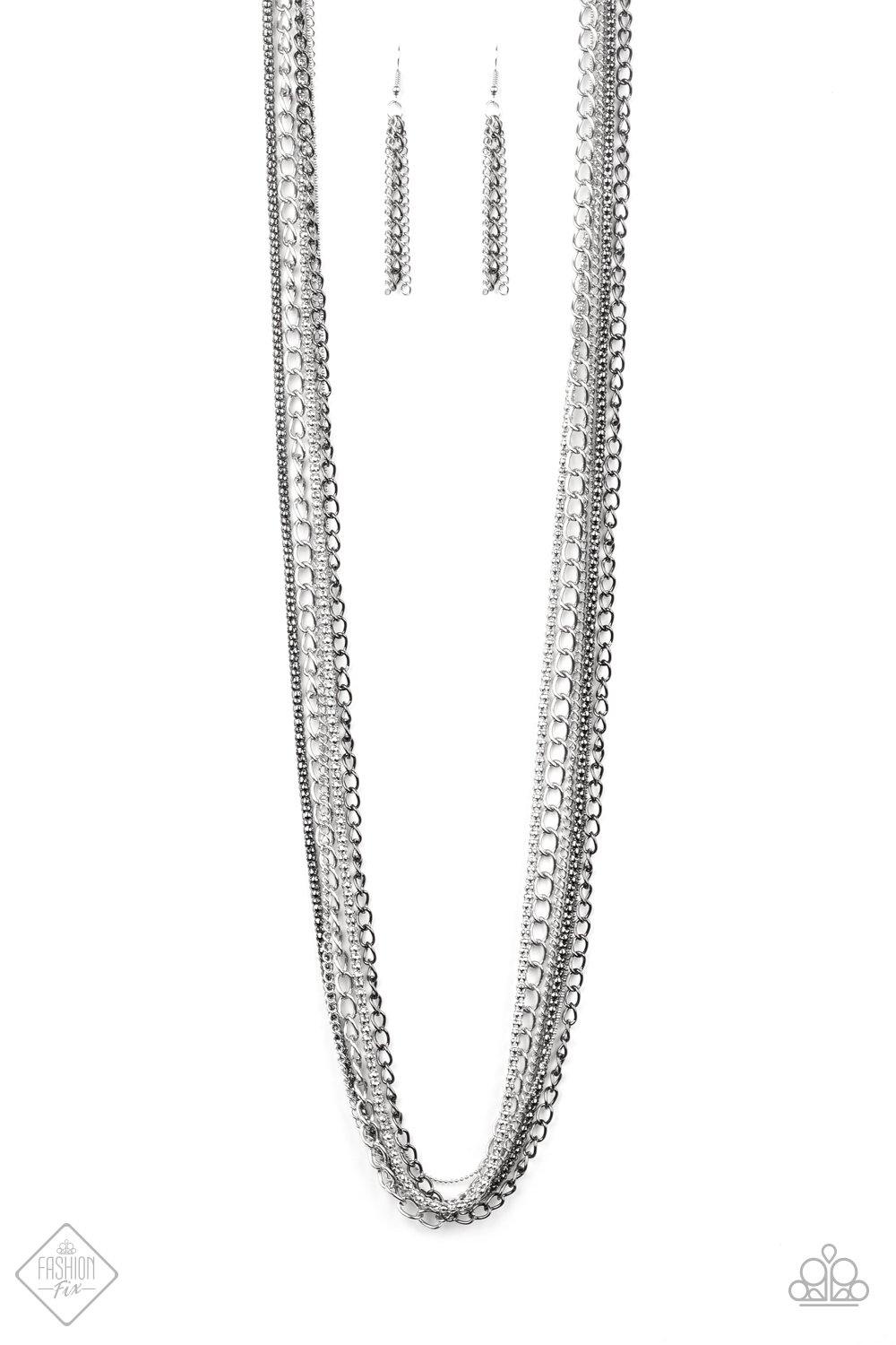 A chaotic mix of popcorn, classic, and dainty chains stream down the chest in an industrial masterpiece. The alternating finishes of shiny silver and glistening gunmetal adds miles of attitude to the design, resulting in an edgy collision of mixed metallic shimmer. Features an adjustable clasp closure.