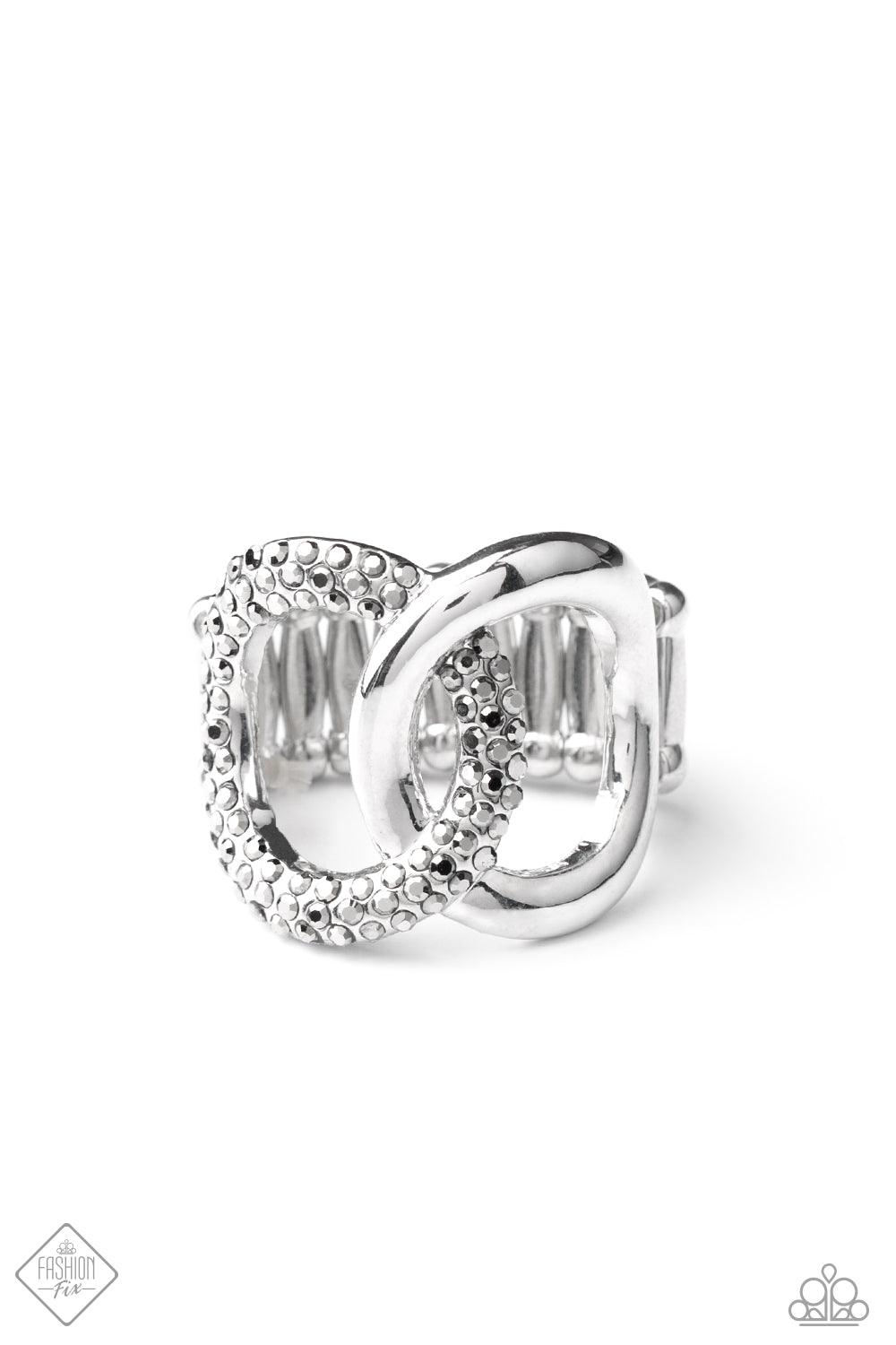 A shiny silver hoop interlocks with a hematite rhinestone encrusted ring, creating a gritty centerpiece that sits boldly atop the finger. Features a stretchy band for a flexible fit.