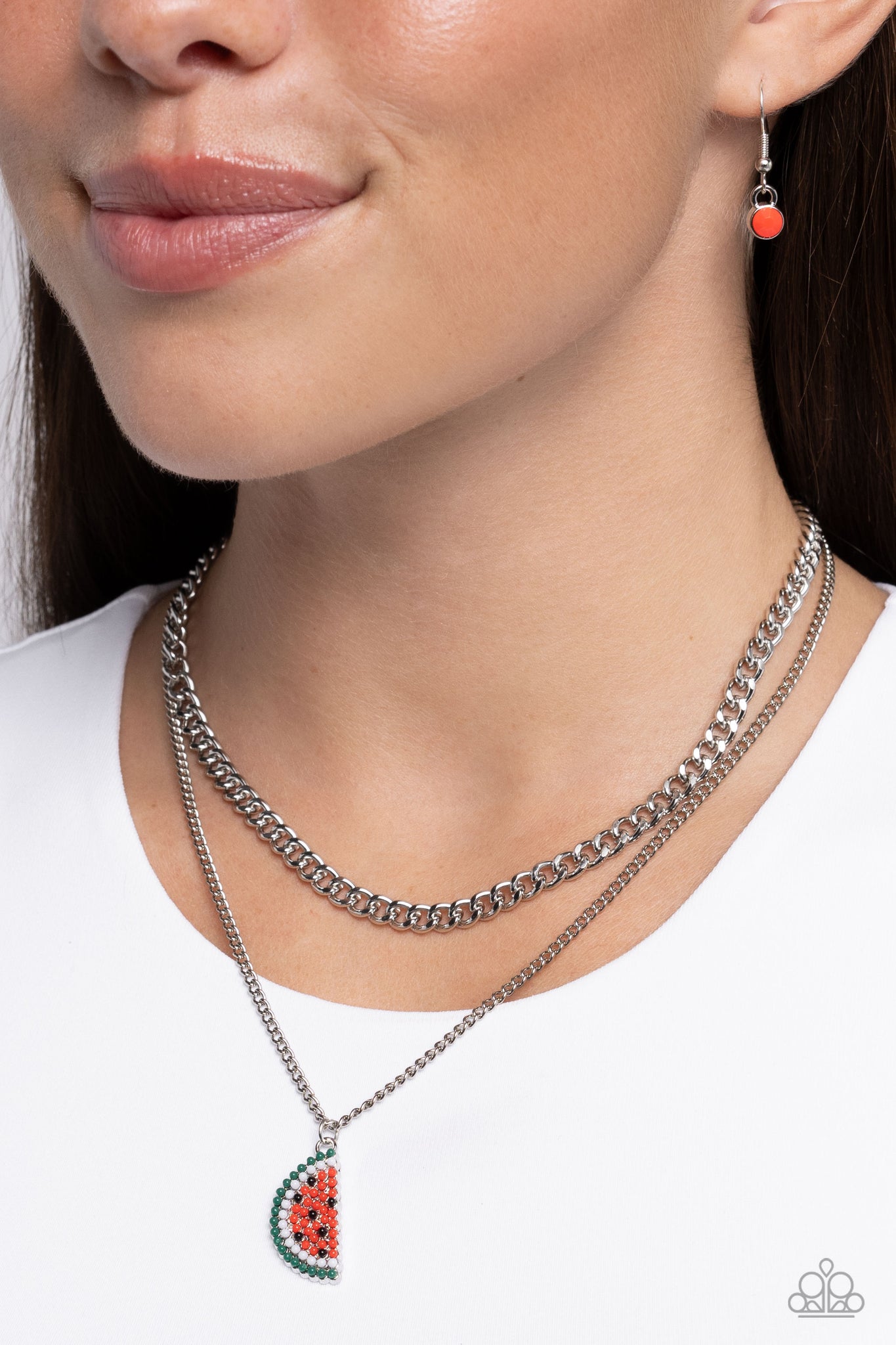 Featuring green, white, black, and red beads, a watermelon-like slice glides along a classic chain for a fresh display. A thicker silver chain layers beside the fruity first layer for additional eye-catching movement. Features an adjustable clasp closure.