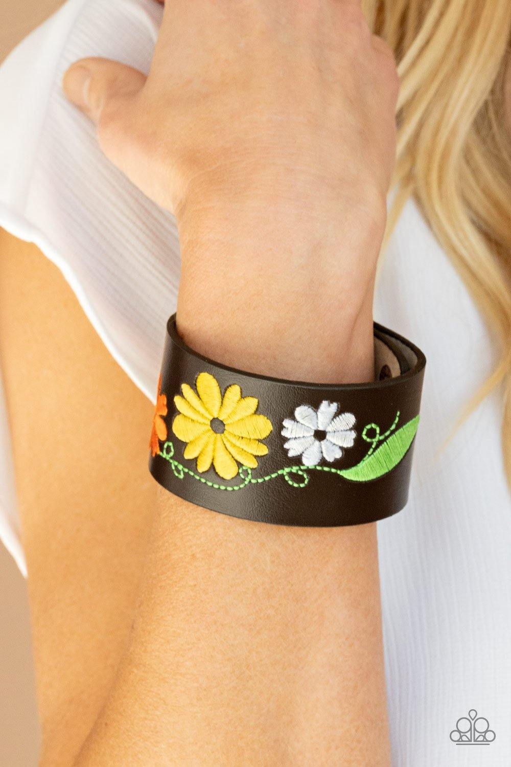 A colorful floral pattern is embroidered across the front of a black leather band, creating a whimsical centerpiece around the wrist. Features an adjustable snap closure.