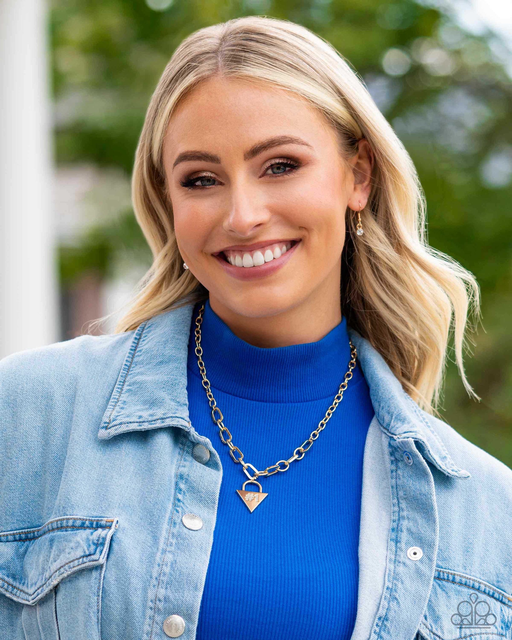 Dangling from a collection of oversized, curved links connected to a gold link chain, a locket-inspired pendant rests in the shape of a triangle. Embossed in white rhinestones, a #1 gleams from the center of the gold pendant for a sports-inspired finish. Features an adjustable clasp closure.